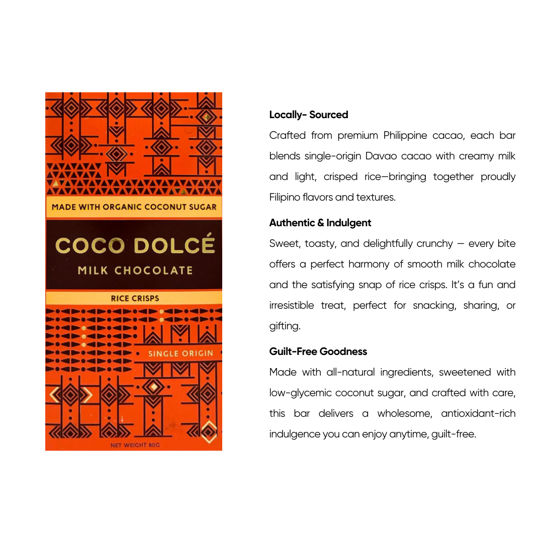 Light, crunchy, and oh-so-satisfying—Coco Dolcé’s Milk Chocolate with Rice Crisps combines smooth milk chocolate with the perfect snap of crisped rice. Guilt-free and fun, made with coconut sugar and real cacao.