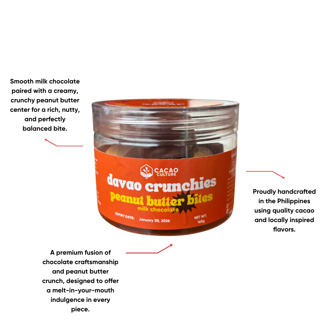 Cacao Culture — Davao Crunchies Peanut Butter Bites coated in luscious milk chocolate. Carefully handcrafted in the Philippines, this treat delivers a satisfying fusion of rich cacao and smooth, nutty goodness.