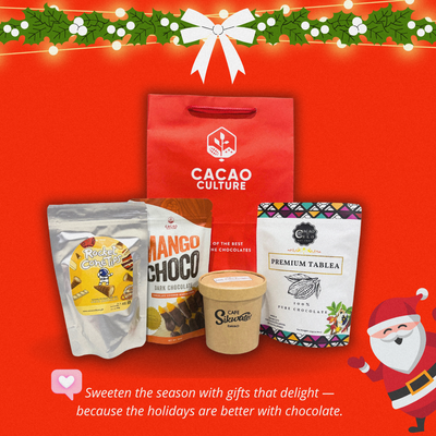 Unwrap the cozy charm of the Merry Mocha Box, a chocolate bundle made for coffee and chocolate lovers alike. This festive set brings together the rich aroma of roasted coffee and the deep, velvety taste of local cacao, your perfect pair for merry mornings or relaxing evenings.