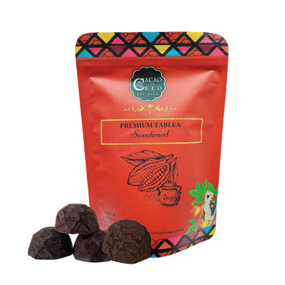 Premium Sweetened tablea by Cacao de Celo, proudly made in Davao City, is crafted from roasted cacao nibs and rich chocolate liquor, delivering a deep and authentic chocolate flavor with natural intensity. This blend creates a smooth, full-bodied texture that melts easily into hot beverages or traditional recipes. With just the right amount of added sugar, it perfectly balances the bold bitterness of pure cacao with a pleasant sweetness, offering a rich and aromatic chocolate experience that reflects the quality and heritage of Davao-grown cacao.